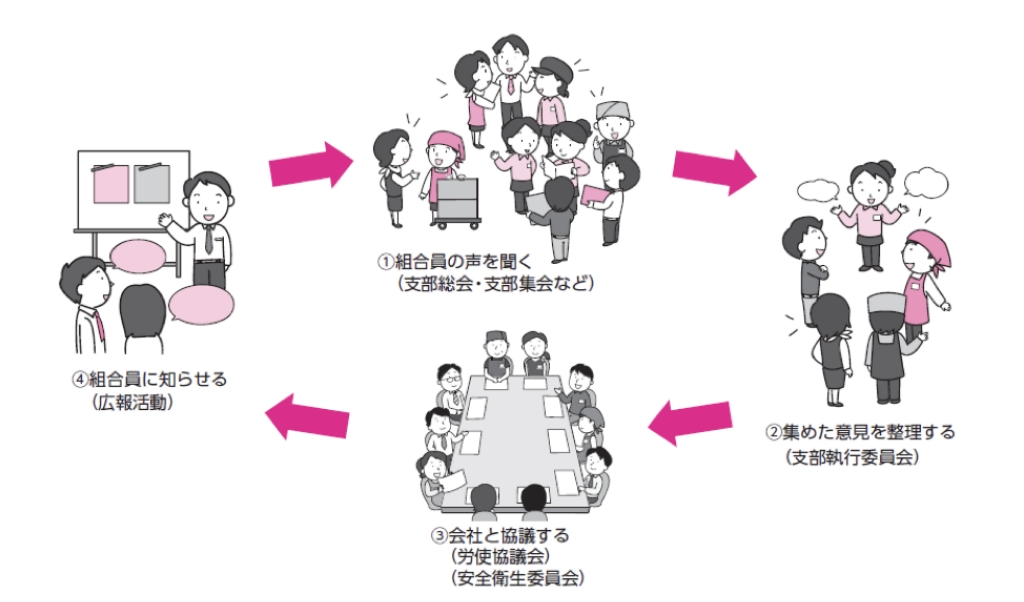 ③支部で解決できない課題は各級労使協議会で取り扱い、職場環境改善に取組みます。