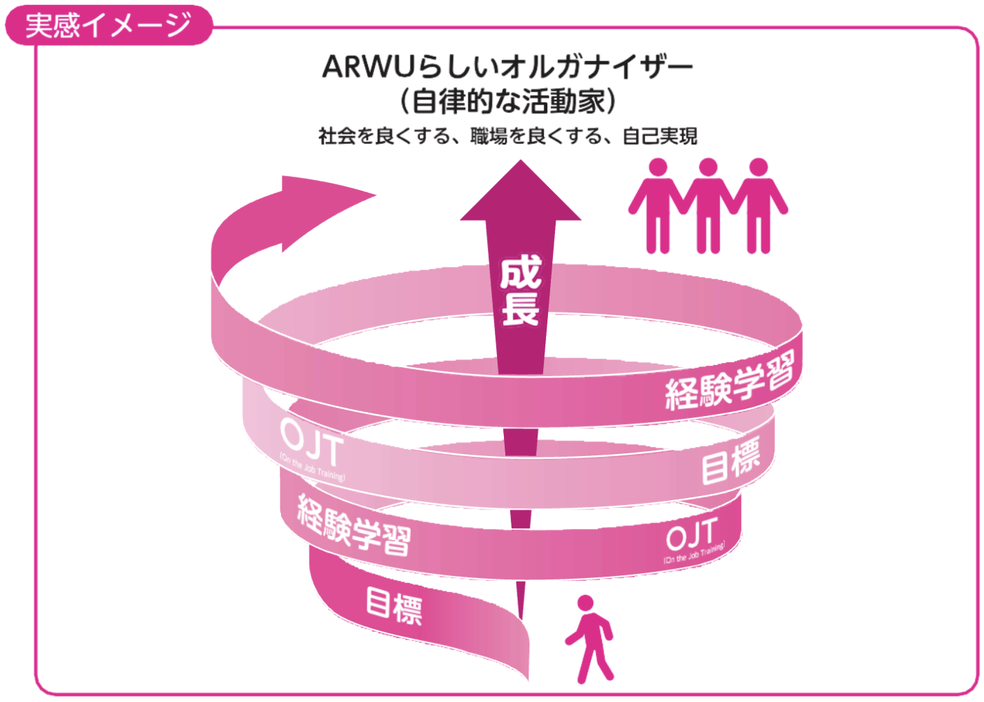 第15期教育PT答申に基づき、目標、OJT、経験学習を柱に、「組織の成長と自己実現できる教育」を実施していきます。(実感イメージ図参照)
