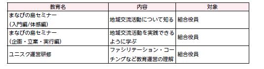 (2)地域を知り、地域から学び、地域と共に問題解決を推進するため、各地域で地域交流プログラムを実施します。また、ユニオン村を起点とした活動や地域交流プログラムを推進するための教育を「NPOまなびの島」などと連携して進めます。(ユニオン村活動・まなびの島セミナー入門編・体感編・企画立案実行編)