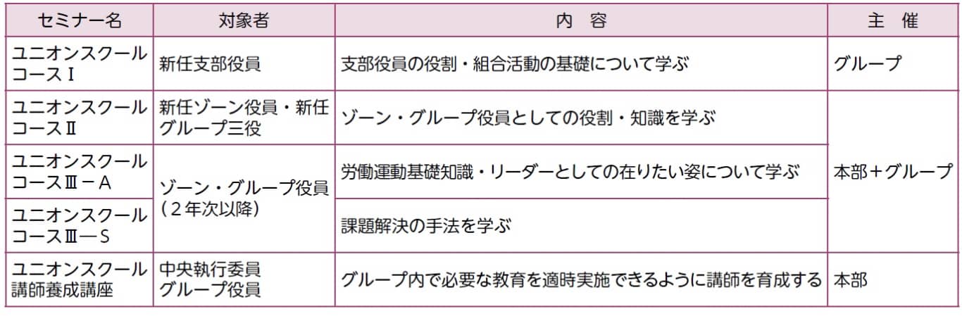 ● 経営課題の解決に必要な経営分析力や、課題解決に必要なスキル(声を聞く⇒課題化⇒労使協議⇒フィードバック)の向上を行います。 - オルガナイザーとして必要な知識・専門性をもつ人材の育成