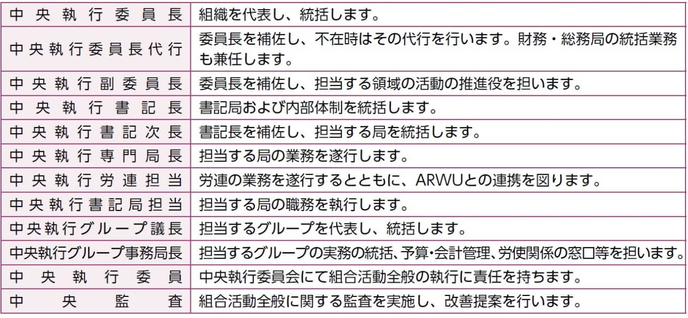 中央執行委員会議案の事前協議や、短期的な活動の方向性の検討、組織の中期的な課題についての解決案を検討します。